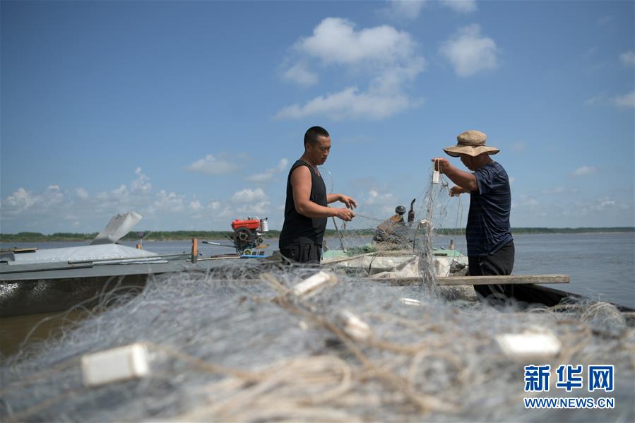 7月22日,在二道江灘地,八岔村的赫哲族村民在整理漁網(wǎng)。新華社記者王建威攝