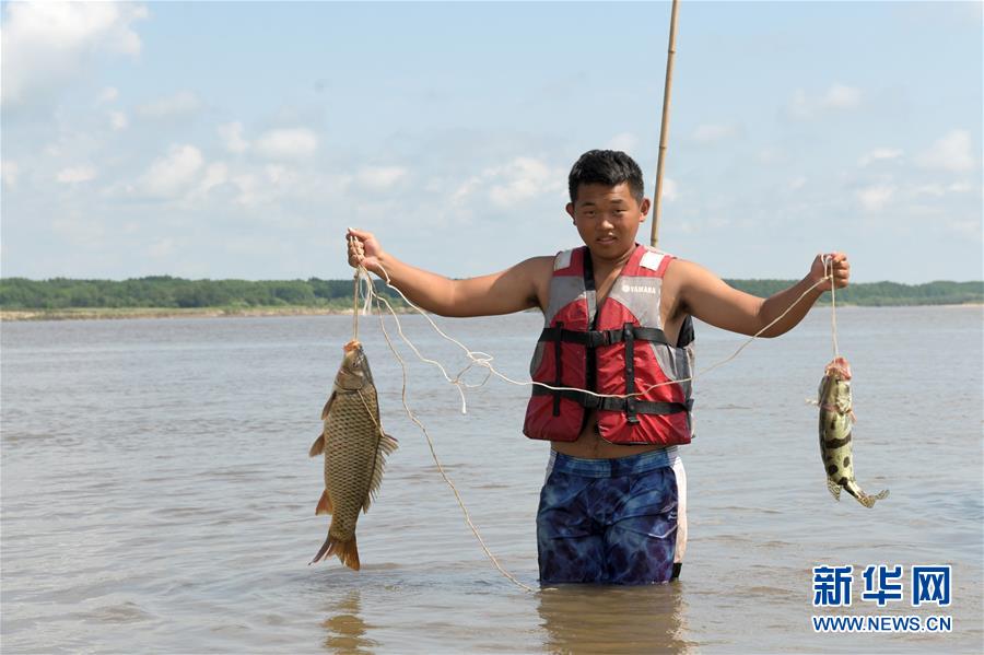 7月22日,在二道江灘地的江邊,赫哲族村民在展示剛打上來的魚。新華社記者王建威攝
