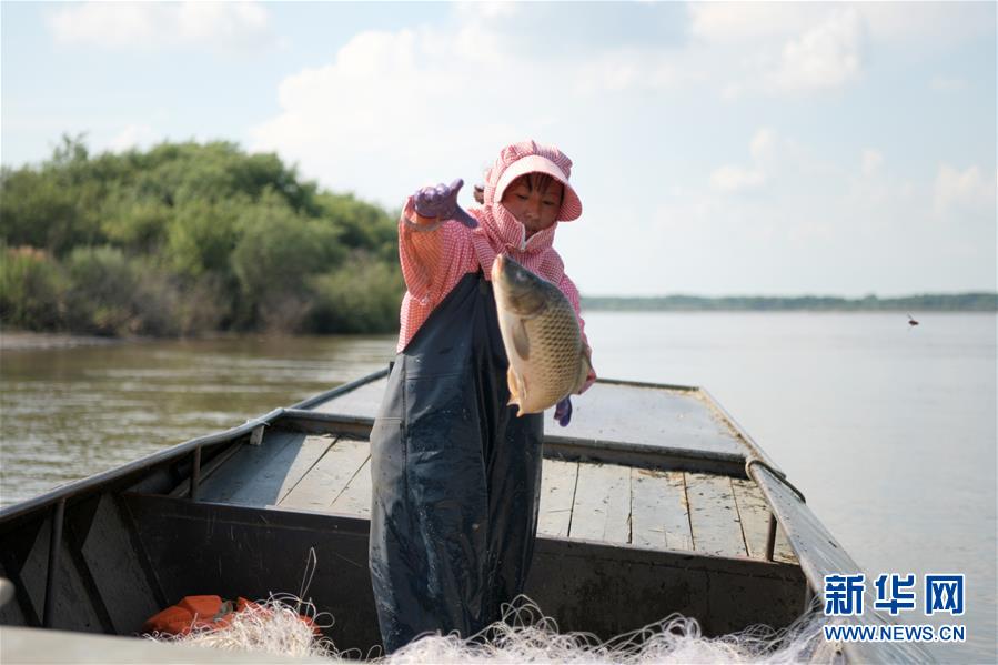 7月22日,在二道江灘地,赫哲族村民劉洪海的妻子叢秀松把剛打上來的魚放進船艙。新華社記者王建威攝