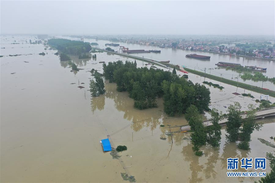 這是7月21日拍攝的被淹的南京市高淳區(qū)陽(yáng)江鎮(zhèn)勝利圩(畫面左側(cè))(無(wú)人機(jī)照片)。新華社記者季春鵬攝