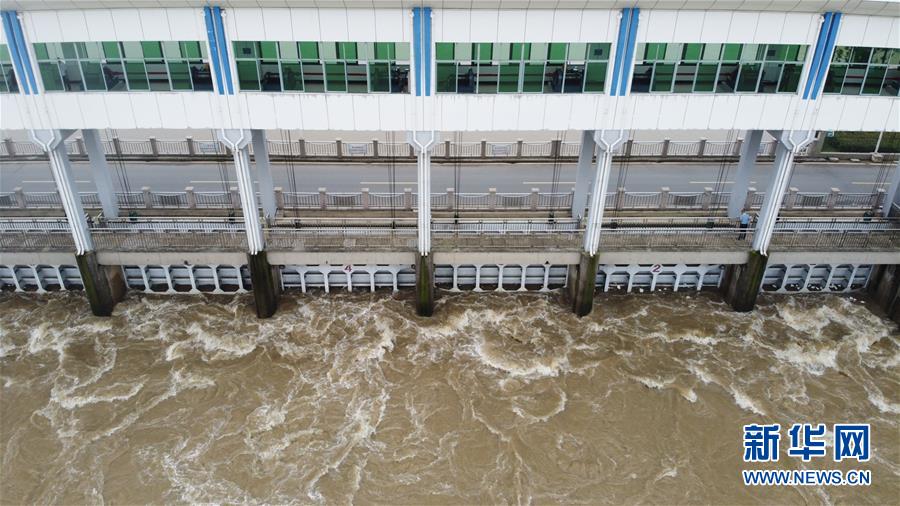 這是7月23日在安徽省阜南縣拍攝的正在關(guān)閘的淮河王家壩閘(無人機照片)。當(dāng)日13時,淮河干流王家壩閘關(guān)閘,停止向蒙洼蓄洪區(qū)泄洪。新華社記者張端攝