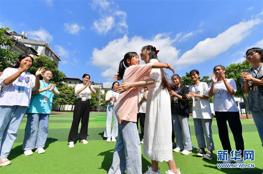 在融水苗族自治縣保桓中學(xué)1813班舉辦的送別班會(huì)上,支教老師林洋港(中右)和同學(xué)們擁抱告別(7月23日攝)。新華社記者黃孝邦攝