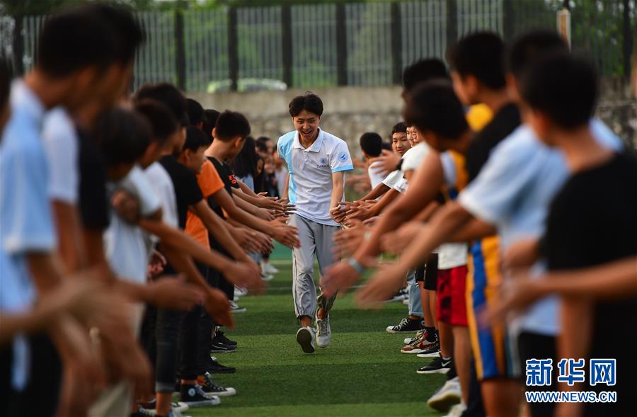 在融水苗族自治縣思源實(shí)驗(yàn)學(xué)校舉辦的支教團(tuán)送別晚會(huì)上,支教老師譚博天(中)接受同學(xué)們的祝福(7月22日攝)。新華社記者黃孝邦攝