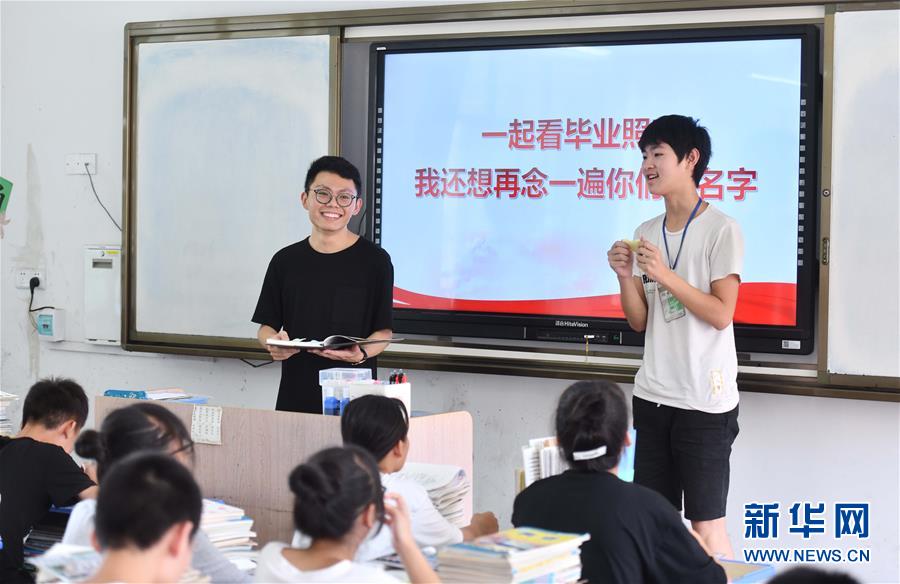 在融水苗族自治縣丹江中學(xué)1708班舉辦的送別班會(huì)上,一名學(xué)生給支教老師溫昌浩(左)送上臨別寄語(yǔ)(7月23日攝)。新華社記者黃孝邦攝