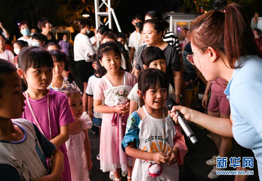 7月23日晚,在成都市成華區(qū)望平街濱河路的天府文創(chuàng)大集市上,參加讀書活動(dòng)的小朋友在介紹自己閱讀過的童話故事。新華社記者 王曦 攝