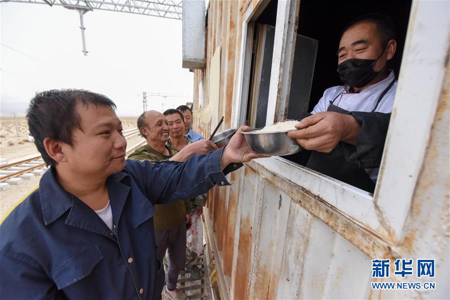 在索爾庫里宿營地,中鐵一局的施工人員排隊打飯(7月19日攝)。新華社記者 丁磊 攝