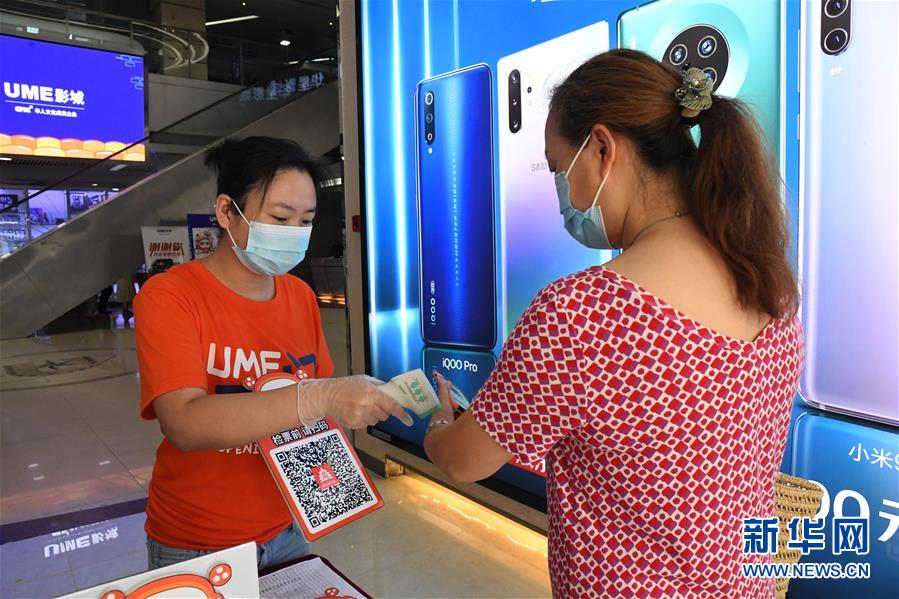 7月24日,在UME影城北京華星店,工作人員(左)為觀眾測(cè)量體溫。當(dāng)日,在做好新冠肺炎疫情防控的前提下,北京市部分電影院有序恢復(fù)開放。新華社記者 任超 攝