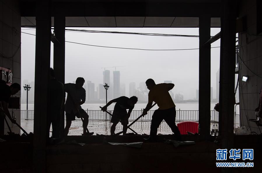 7月6日,工作人員在武漢龍王廟封堵閘口。新華社記者 肖藝九 攝