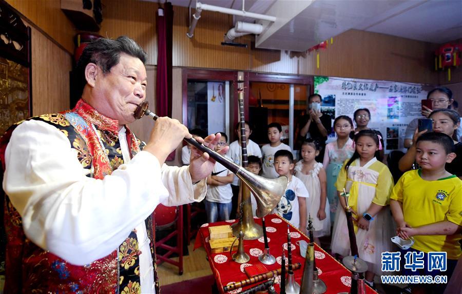 7月26日,在石家莊市橋西區(qū)休門街道休門西街社區(qū),休門吹歌傳承人付錫芬(左一)在傳授嗩吶吹奏技巧。當(dāng)日,河北省石家莊市橋西區(qū)暑期“非遺”小課堂開班。河北省級非物質(zhì)文化遺產(chǎn)休門吹歌傳承人走進(jìn)休門街道休門西街社區(qū),為轄區(qū)小朋友講解休門吹歌歷史,傳授非遺技藝,豐富他們的暑期生活。新華社記者 王曉 攝