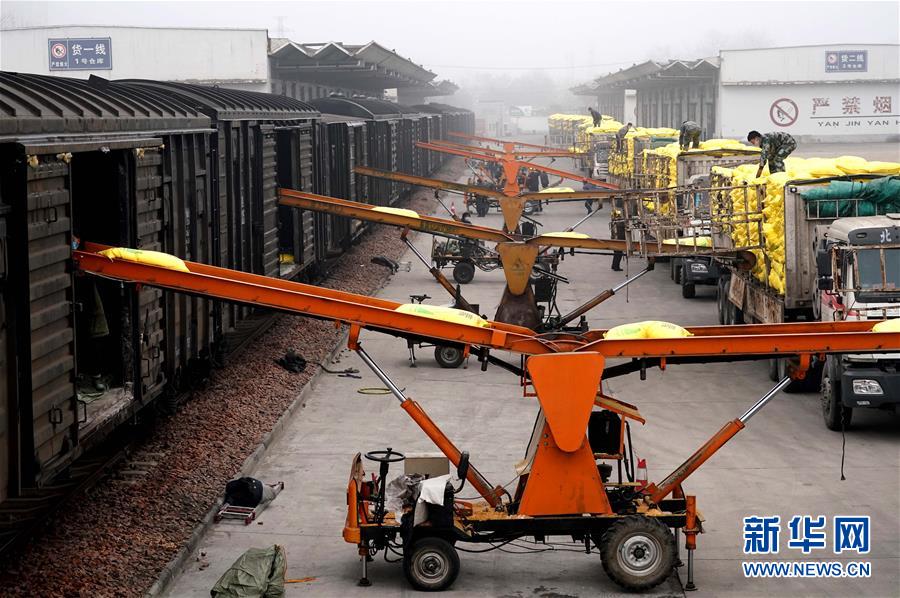 在中國(guó)鐵路鄭州局集團(tuán)有限公司開(kāi)封車站,工作人員使用傳輸機(jī)裝運(yùn)春耕物資(2月13日攝)。新華社記者 李安 攝