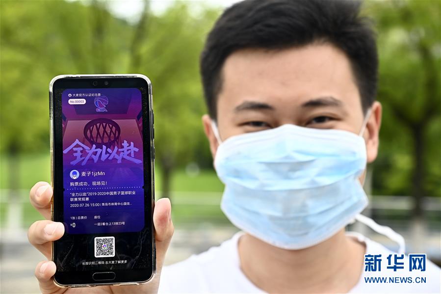 7月26日,在青島國信體育館,蘇柯帆展示自己的CBA電子票。他成為CBA聯(lián)賽復(fù)賽允許觀眾現(xiàn)場觀賽后,首位進(jìn)場的觀眾。當(dāng)日,在山東青島舉行的2019-2020賽季中國男子籃球職業(yè)聯(lián)賽(CBA)復(fù)賽第二階段(嶗山賽區(qū))比賽中,醫(yī)護(hù)人員、教師、公安戰(zhàn)線人士通過官方購票平臺,完成包括核酸檢測在內(nèi)的相關(guān)流程后進(jìn)場觀看了上海久事隊迎戰(zhàn)山東西王隊的比賽。觀賽期間,觀賽者須全程佩戴口罩,對號入座,嚴(yán)格保持間隔一米就座。退場時,觀眾須按照自后向前、先兩邊后中間的順序,保持“一米線”社交距離有序退場。新華社記者 郭緒雷 攝