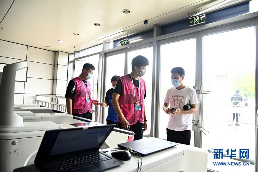 7月26日,在青島國信體育館,蘇柯帆(右)正在進場。他成為CBA聯(lián)賽允許觀眾現(xiàn)場觀賽后,首位進場的觀眾。當日,在山東青島舉行的2019-2020賽季中國男子籃球職業(yè)聯(lián)賽(CBA)復賽第二階段(嶗山賽區(qū))比賽中,醫(yī)護人員、教師、公安戰(zhàn)線人士通過官方購票平臺,完成包括核酸檢測在內的相關流程后進場觀看了上海久事隊迎戰(zhàn)山東西王隊的比賽。觀賽期間,觀賽者須全程佩戴口罩,對號入座,嚴格保持間隔一米就座。退場時,觀眾須按照自后向前、先兩邊后中間的順序,保持“一米線”社交距離有序退場。新華社記者 郭緒雷 攝