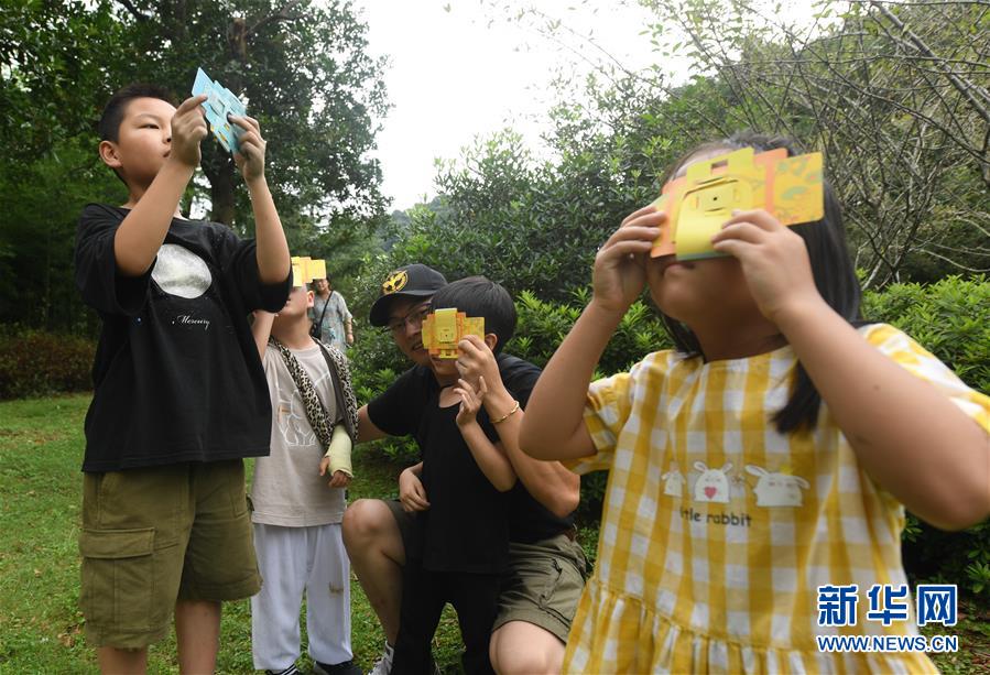 7月27日,小朋友們用自制的便攜顯微鏡觀察樹葉。新華社記者 翁忻旸 攝