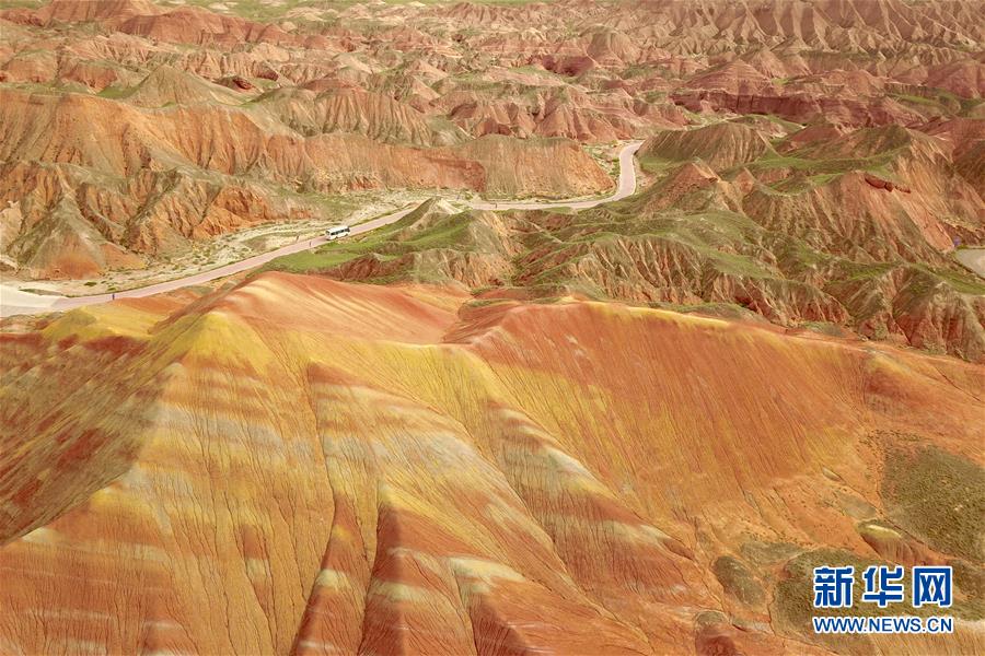 這是7月27日拍攝的張掖世界地質(zhì)公園七彩丹霞景區(qū)景觀(guān)(無(wú)人機(jī)照片)。新華社記者 范培珅 攝