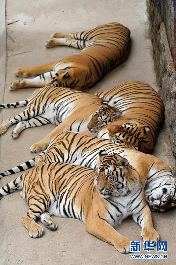 7月28日,在橫道河子東北虎林園,東北虎在休息。時值盛夏,位于黑龍江省海林市的橫道河子東北虎林園的東北虎活動量減少,以不同方式消夏納涼。新華社記者王建威攝