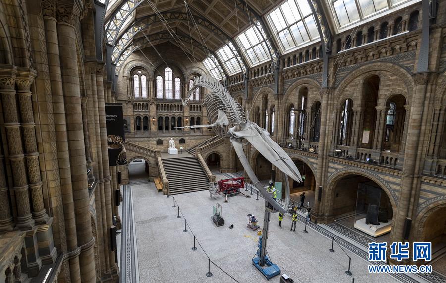 7月27日,工作人員在英國倫敦的自然歷史博物館大廳內(nèi)清潔一具藍(lán)鯨骨架。受新冠疫情影響關(guān)閉數(shù)月的英國自然歷史博物館將于8月5日重新對外開放,目前館方正在為重新開放做最后準(zhǔn)備。參觀者需要提前預(yù)約參觀時段、全程佩戴口罩且保持安全距離。新華社記者韓巖攝