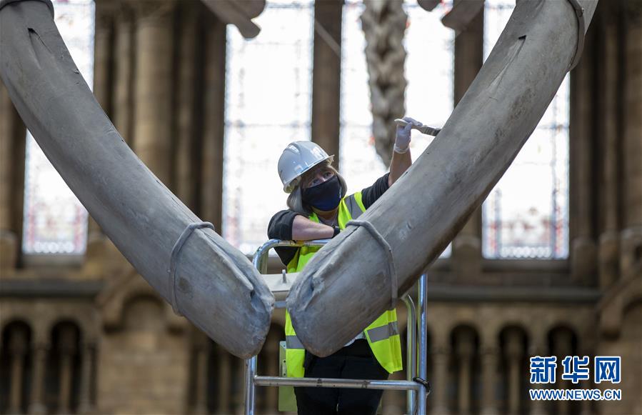 7月27日,一名工作人員在英國倫敦的自然歷史博物館大廳內(nèi)清潔一具藍鯨骨架。受新冠疫情影響關(guān)閉數(shù)月的英國自然歷史博物館將于8月5日重新對外開放,目前館方正在為重新開放做最后準(zhǔn)備。參觀者需要提前預(yù)約參觀時段、全程佩戴口罩且保持安全距離。新華社記者韓巖攝