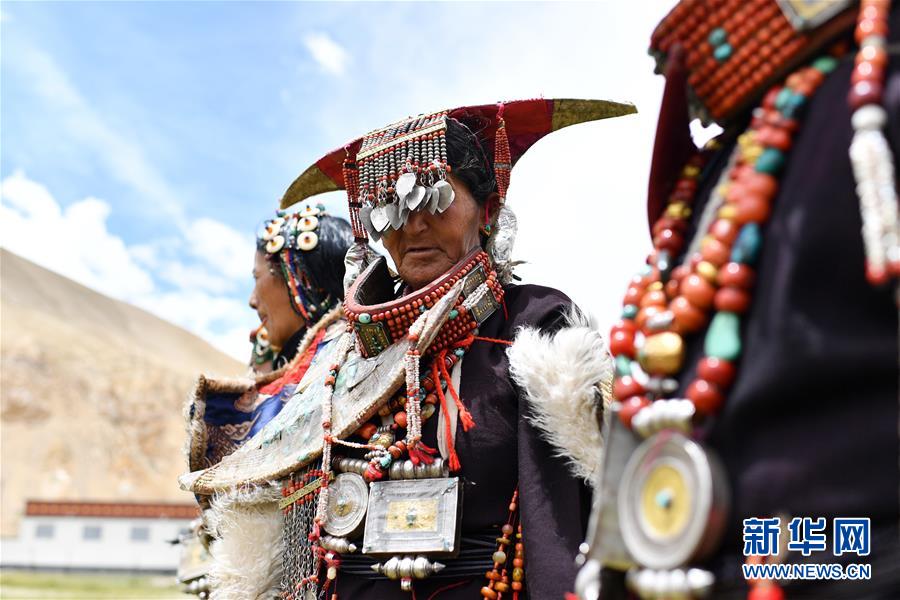 在西藏阿里地區(qū)普蘭縣科迦村,村民在展示普蘭服飾(7月28日攝)。在西藏阿里地區(qū)普蘭縣,至今保留著獨(dú)特的藏族服飾——普蘭服飾。據(jù)了解,普蘭服飾已有1000多年的歷史,其中最精美、最獨(dú)特的是婦女的“孔雀”服飾,一套重達(dá)20多公斤,裝飾有黃金、白銀、蜜蠟、珊瑚、綠松石等,堪稱(chēng)“穿在身上的千年歷史”。新華社記者詹彥攝