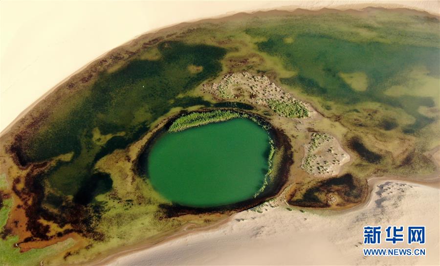 這是青海湖沙島風光(7月28日攝,無人機照片)。盛夏傍晚,位于青海湖東北部的沙島,島內湖泊星羅棋布,沙丘連綿起伏,風景別致。金沙與湖水掩映,在陽光的勾勒下形成一幅美麗的畫卷。新華社記者張宏祥攝