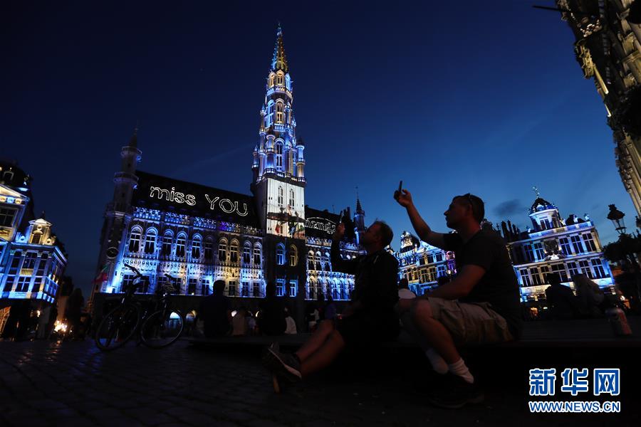 7月29日,人們?cè)诒壤麜r(shí)布魯塞爾大廣場(chǎng)欣賞聲光秀,市政廳外墻上投射出“想念你,音樂(lè)”的字樣。7月29日,比利時(shí)布魯塞爾大廣場(chǎng)舉行大型聲光秀。藝術(shù)家在市政廳等歷史建筑上投影文字和圖案,紀(jì)念這個(gè)夏天受新冠疫情影響而不能如期舉辦的文化活動(dòng)。新華社記者鄭煥松攝
