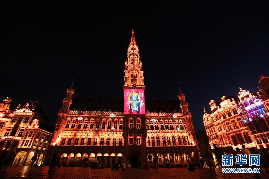 7月29日,人們?cè)诒壤麜r(shí)布魯塞爾大廣場(chǎng)欣賞聲光秀。7月29日,比利時(shí)布魯塞爾大廣場(chǎng)舉行大型聲光秀。藝術(shù)家在市政廳等歷史建筑上投影文字和圖案,紀(jì)念這個(gè)夏天受新冠疫情影響而不能如期舉辦的文化活動(dòng)。新華社記者鄭煥松攝