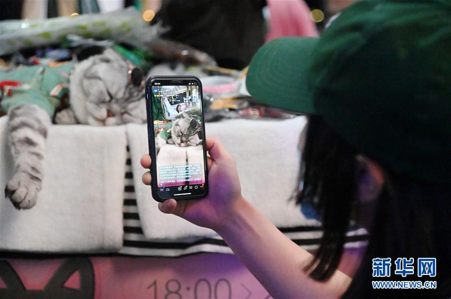 在“夜貓市集”上,一名女孩在直播自己領養(yǎng)的寵物貓(7月29日攝)。新華社記者張浩然攝