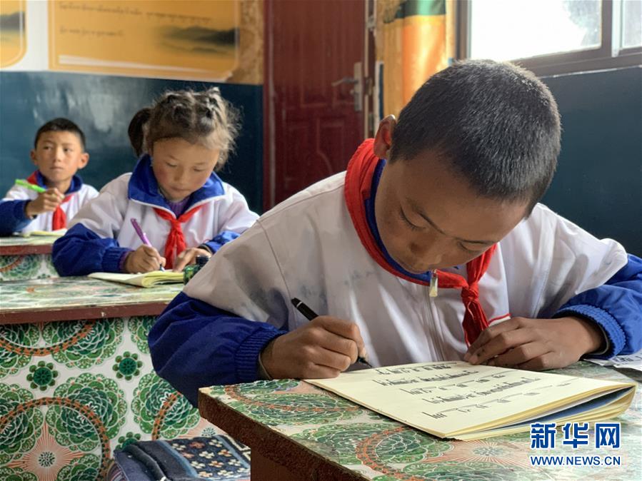 拉孜鄉(xiāng)中心小學(xué)學(xué)生在練習(xí)藏文書法(7月29日攝)。新華社記者唐弢攝