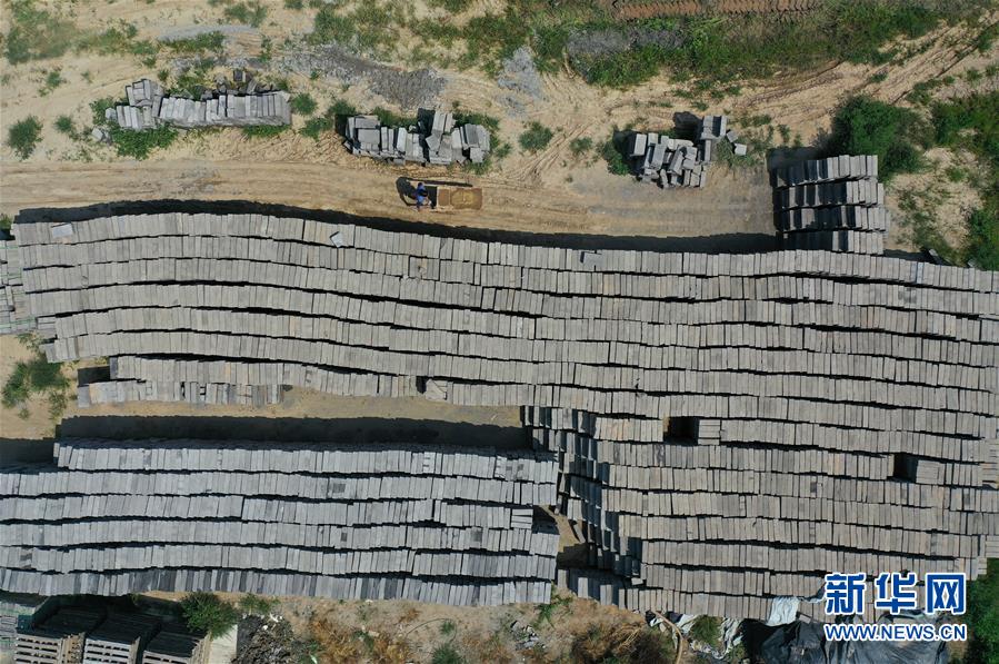7月30日,河北省任丘市出岸鎮(zhèn)古建磚廠工人在搬運(yùn)磚坯(無(wú)人機(jī)照片)。
