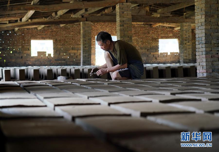 7月30日,河北省任丘市出岸鎮(zhèn)古建磚廠工人在制作磚坯。新華社記者牟宇攝