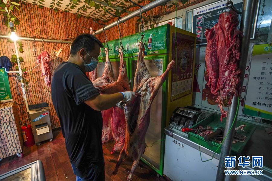 7月30日,在烏魯木齊經(jīng)濟技術(shù)開發(fā)區(qū)(頭屯河區(qū))天鵝湖社區(qū)牛羊肉直銷點,商販在分割新鮮羊肉。新華社記者趙戈攝