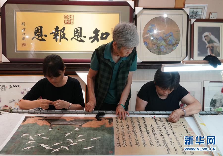 在開封市素花宋繡工藝有限公司的展示館里,王素花(中)在指導(dǎo)徒弟們刺繡(7月30日攝)。新華社記者李嘉南攝