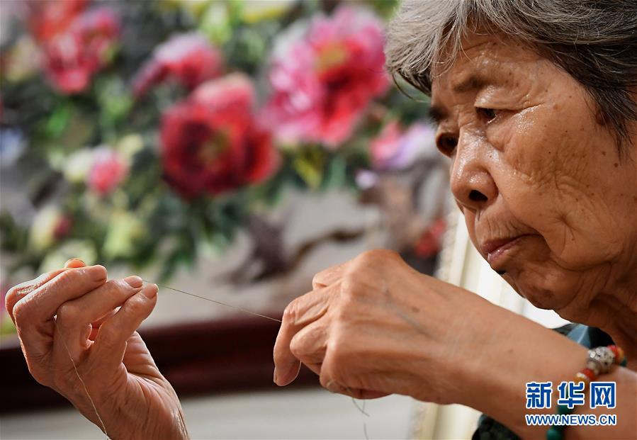 在開(kāi)封市素花宋繡工藝有限公司的展示館里,王素花在劈線(7月30日攝)。新華社記者李安攝