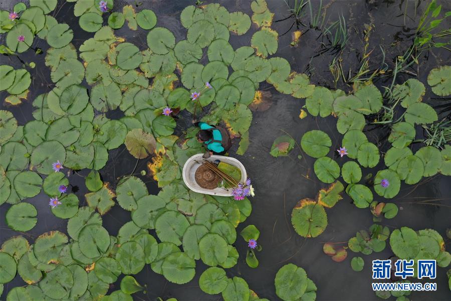 8月4日,藝溯家生態(tài)農場工作人員在池塘采摘香水蓮花(無人機照片)。近年來,位于浙江湖州吳興區(qū)八里店鎮(zhèn)移沿山村的藝溯家生態(tài)農場,在約45畝的傳統(tǒng)水產養(yǎng)殖池塘上規(guī)模化種植香水蓮花,既凈化水質,又提高了經濟效益。農場還設計出種植、采摘和加工香水蓮花的工藝流程,以面向更多農戶推廣。新華社記者黃宗治攝