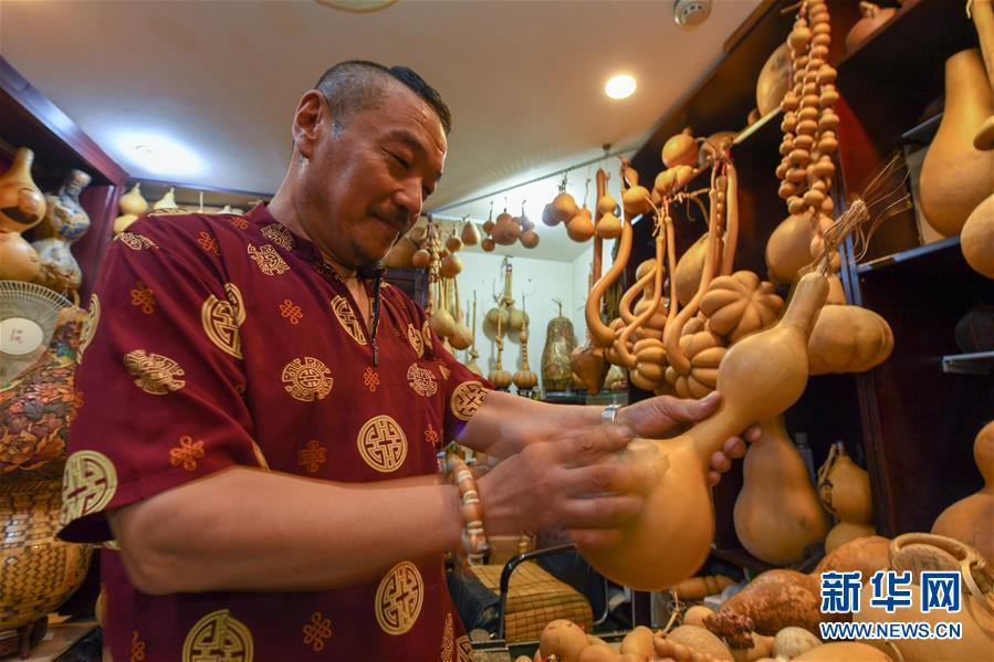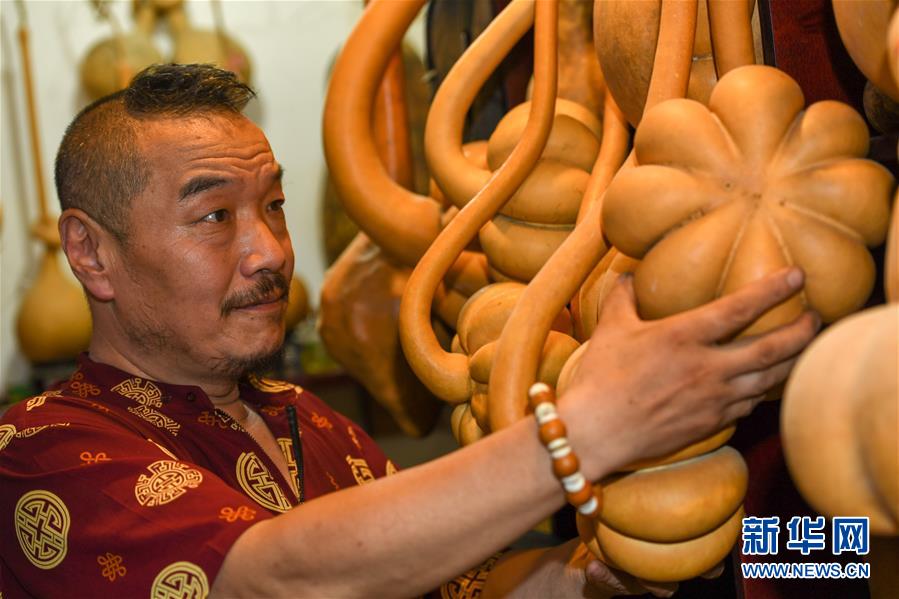 8月5日,侯景偉挑選適合創(chuàng)作的葫蘆。今年55歲的吉林四平人侯景偉自幼與家人學(xué)習(xí)雕刻、烙畫(huà)藝術(shù)。經(jīng)過(guò)多年潛心研究,他將浮雕和烙畫(huà)工藝相結(jié)合,通過(guò)拋光、起稿、雕刻、烙燙、套色等十余道工藝,制作展現(xiàn)傳統(tǒng)文化、民俗故事的葫蘆工藝品。2020年,侯景偉被評(píng)為四平市非物質(zhì)文化遺產(chǎn)項(xiàng)目侯氏葫蘆雕刻烙畫(huà)代表性傳承人。他說(shuō):“希望有更多人加入到非遺傳承隊(duì)伍中,讓小葫蘆‘講’出更多民俗故事?!毙氯A社記者張楠攝