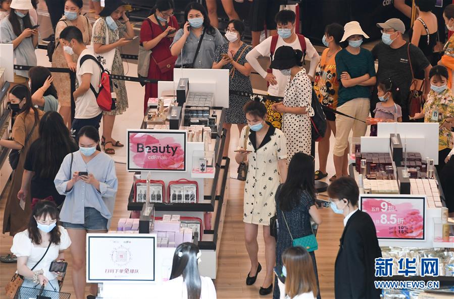 8月6日,游客在三亞國際免稅城排隊進(jìn)店。新華社記者楊冠宇攝