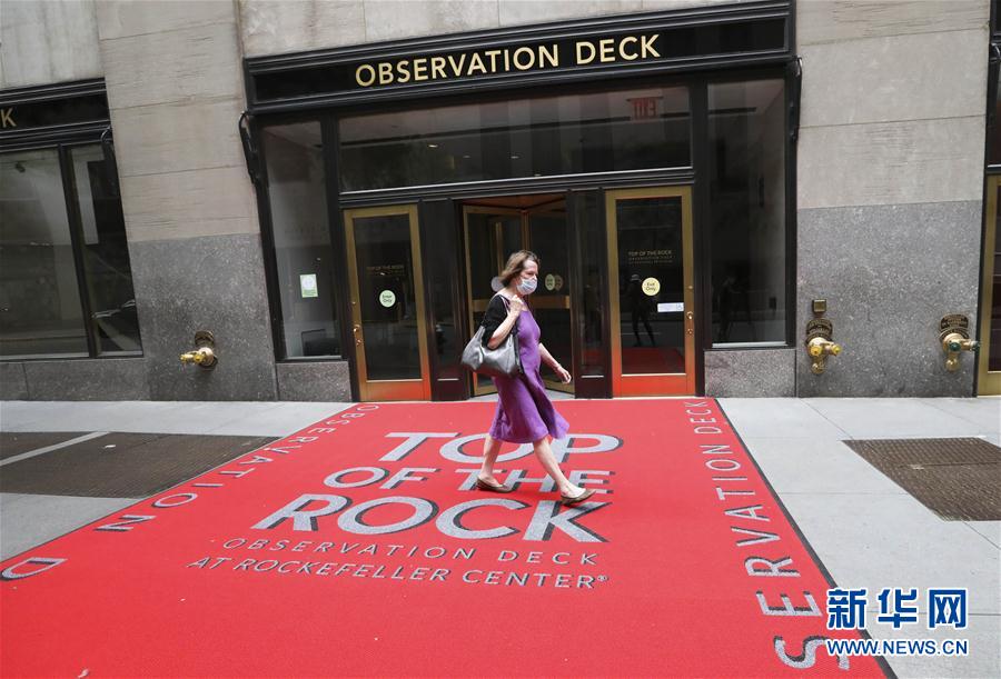8月6日,在美國紐約,一名女子從洛克菲勒中心觀景臺的入口走過。當日,3月份暫時關(guān)閉的洛克菲勒中心觀景臺恢復對公眾開放。每天13時至21時,人們可戴口罩前往參觀。新華社記者王迎攝
