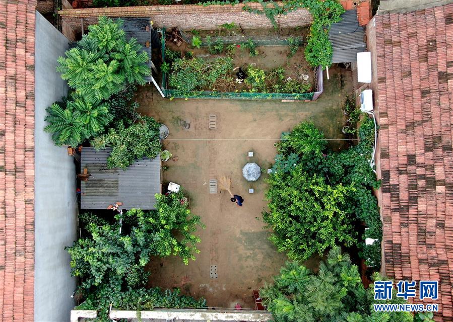 8月5日,王曉楠與父親在自家庭院內(nèi)勞作(無人機(jī)照片)。新華社記者郝源攝