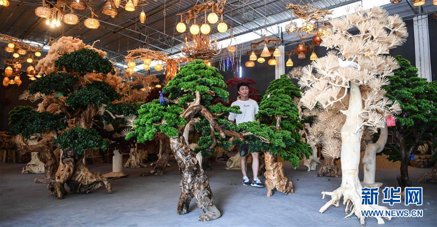 這是8月7日在永??h永安鄉(xiāng)根雕工藝品就業(yè)扶貧車間拍攝的根雕工藝品。2017年以來,廣西桂林市永福縣永安鄉(xiāng)通過幫扶返鄉(xiāng)青年創(chuàng)業(yè)的方式,建立起根雕工藝品就業(yè)扶貧車間,組織貧困群眾進車間務工學藝,把當?shù)刎S富的朽木和柑橘樹根枝資源利用起來,加工成盆景、茶桌、吊燈等根雕工藝品,不僅幫助貧困群眾在家門口掌握一技之長,還讓他們在脫貧摘帽后實現(xiàn)穩(wěn)定增收。新華社記者張愛林攝