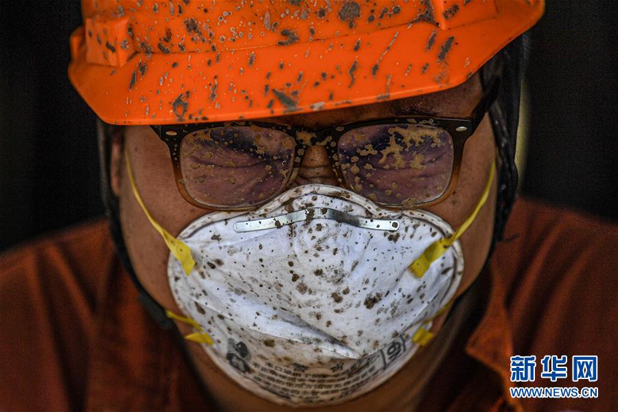 7月27日,在位于南海北部海域的勘探三號鉆井平臺(tái)上,一名鉆井工人在作業(yè)時(shí)眼鏡和口罩沾滿了泥漿。新華社記者蒲曉旭攝