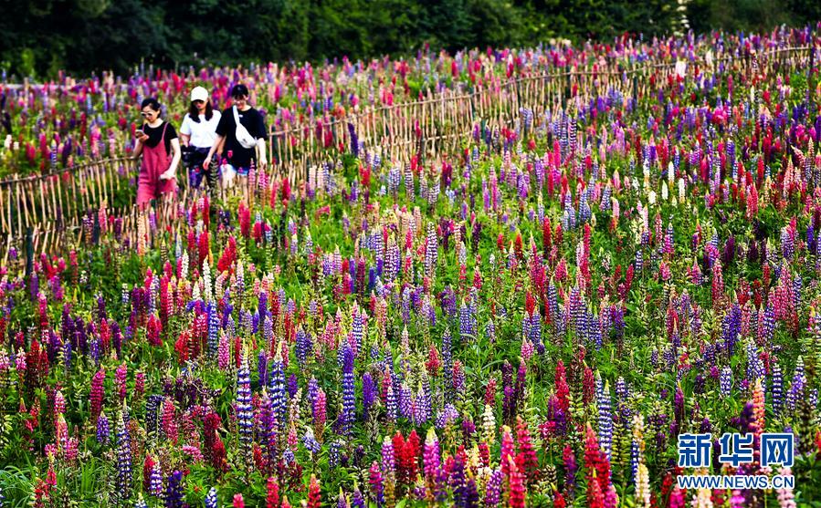 游客在陜西寶雞市太白縣咀頭鎮(zhèn)七里川村的魯冰花產(chǎn)業(yè)園內(nèi)觀光游覽(7月4日攝)。近年來,陜西地處秦巴山區(qū)的多個縣市結(jié)合當?shù)刈匀粴夂驐l件打造特色花海景觀,利用“花海經(jīng)濟”助力脫貧攻堅和鄉(xiāng)村振興。新華社記者劉瀟攝。