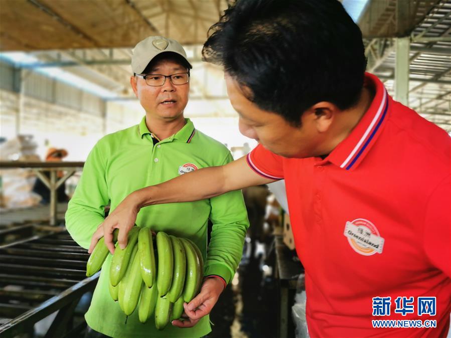 7月16日,在柬埔寨桔井省的柬埔寨—中國(guó)熱帶生態(tài)農(nóng)業(yè)合作示范區(qū)內(nèi),綠洲農(nóng)業(yè)發(fā)展(柬埔寨)有限公司總經(jīng)理高冠華(右)和公司香蕉產(chǎn)業(yè)技術(shù)副總監(jiān)吳誠(chéng)檢查香蕉的品質(zhì)(手機(jī)拍攝)。新華社記者毛鵬飛攝。