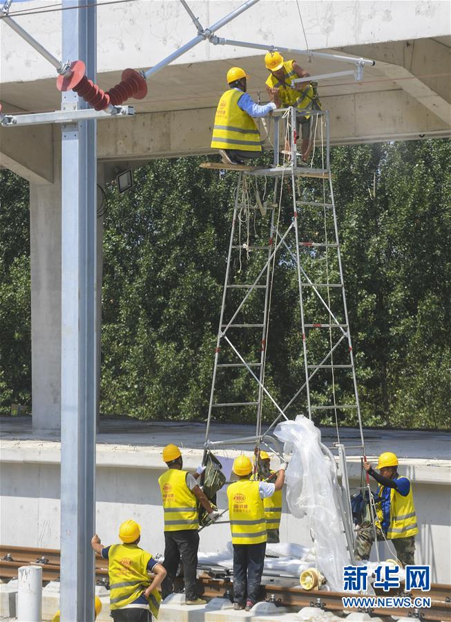 8月10日,工人在京雄城際鐵路霸州北站建設工地為接觸網卡定位。京雄城際鐵路霸州北站站臺雨棚混凝土結構施工日前全部完成,目前霸州北站已全面轉入裝飾裝修和機電安裝階段,預計2020年底投入使用。京雄城際鐵路是連接北京市區(qū)、大興機場和雄安新區(qū)的重要干線。建成后,將進一步完善京津冀區(qū)域高速鐵路網結構,便利沿線群眾出行,對于推動京津冀協同發(fā)展和支撐建設雄安新區(qū)具有重要意義。新華社記者李曉果攝。