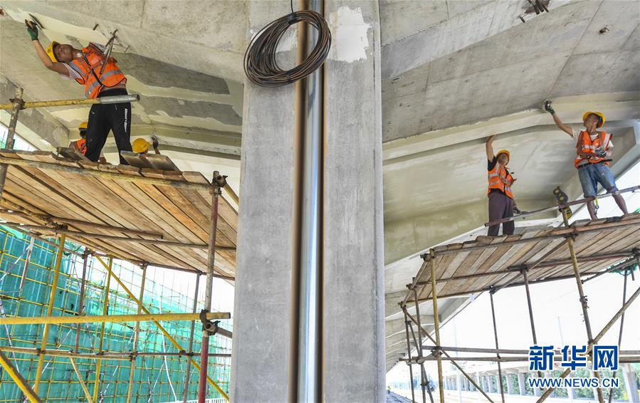 8月10日,工人在京雄城際鐵路霸州北站建設工地為雨棚梁底抹膩子。京雄城際鐵路霸州北站站臺雨棚混凝土結構施工日前全部完成,目前霸州北站已全面轉(zhuǎn)入裝飾裝修和機電安裝階段,預計2020年底投入使用。京雄城際鐵路是連接北京市區(qū)、大興機場和雄安新區(qū)的重要干線。建成后,將進一步完善京津冀區(qū)域高速鐵路網(wǎng)結構,便利沿線群眾出行,對于推動京津冀協(xié)同發(fā)展和支撐建設雄安新區(qū)具有重要意義。新華社記者李曉果攝。