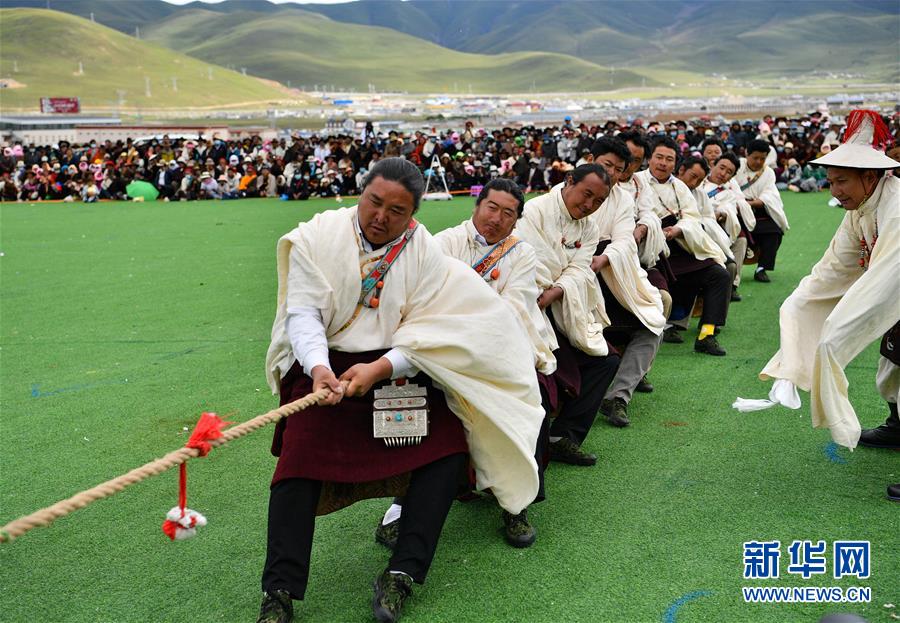 8月10日,當雄縣牧民在拔河比賽中。新華社記者晉美多吉攝。