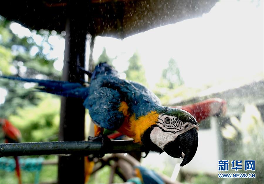 8月11日,上海動(dòng)物園的金剛鸚鵡在享受噴淋降溫。當(dāng)日,上海最高溫度達(dá)到35攝氏度,上海動(dòng)物園開啟園內(nèi)安裝的各種噴淋裝置,讓動(dòng)物們防暑降溫,樂享清涼。新華社記者張建松攝