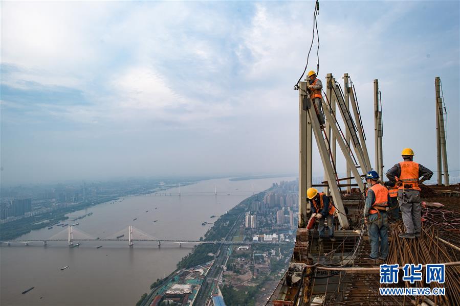 8月11日,工人在武漢綠地中心項目建設(shè)現(xiàn)場近500米的高空施工。新華社記者肖藝九攝