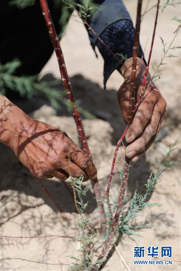 甘肅省金昌市永昌縣下四壩村村民徐文國(guó)在檢查紅柳苗的生長(zhǎng)情況,這株紅柳苗是他今年剛栽下的(7月10日攝)。新華社記者 杜哲宇 攝