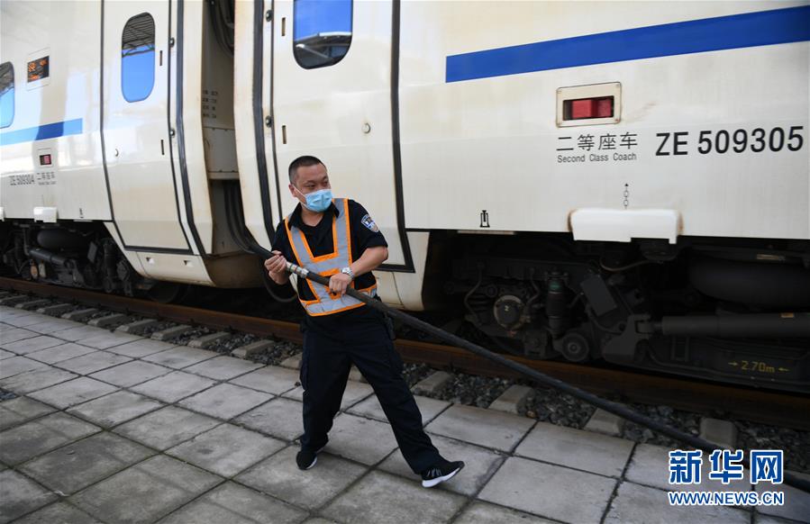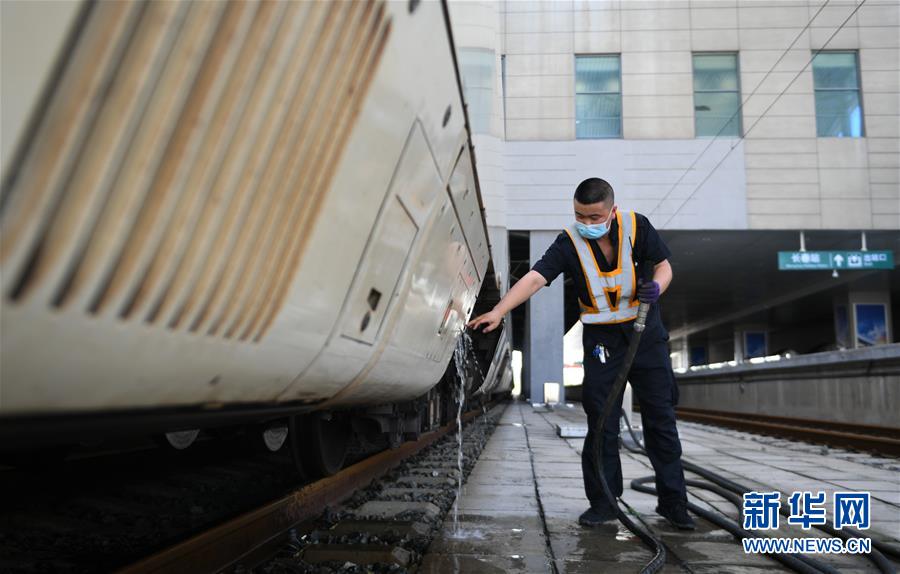 8月12日,長(zhǎng)春火車(chē)站客運(yùn)車(chē)間上水工韓冰在給列車(chē)上水。新華社記者 林宏 攝