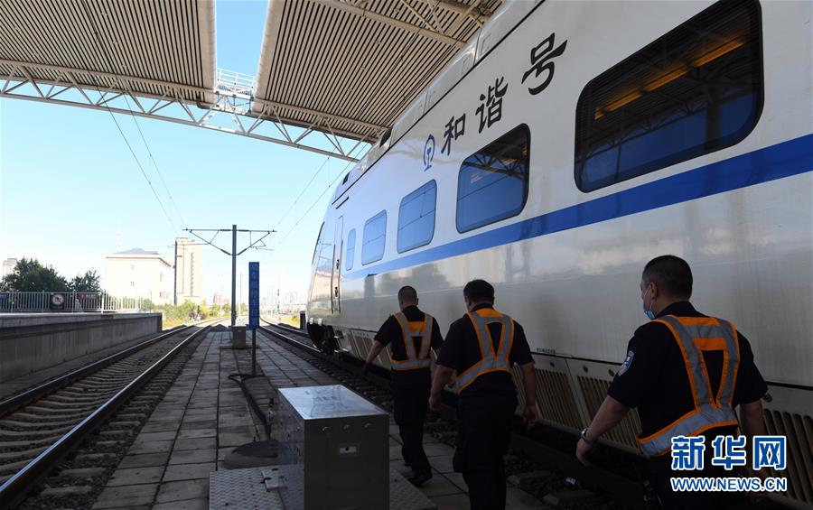 8月12日,長(zhǎng)春火車(chē)站客運(yùn)車(chē)間上水班組趕往下一個(gè)作業(yè)站臺(tái)。新華社記者 林宏 攝