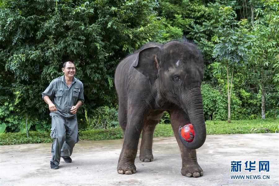 8月12日,在西雙版納傣族自治州亞洲象種源繁育及救助中心,救助象“羊妞”在生日會(huì)上與一名“象爸爸”玩皮球。新華社記者 陳欣波 攝